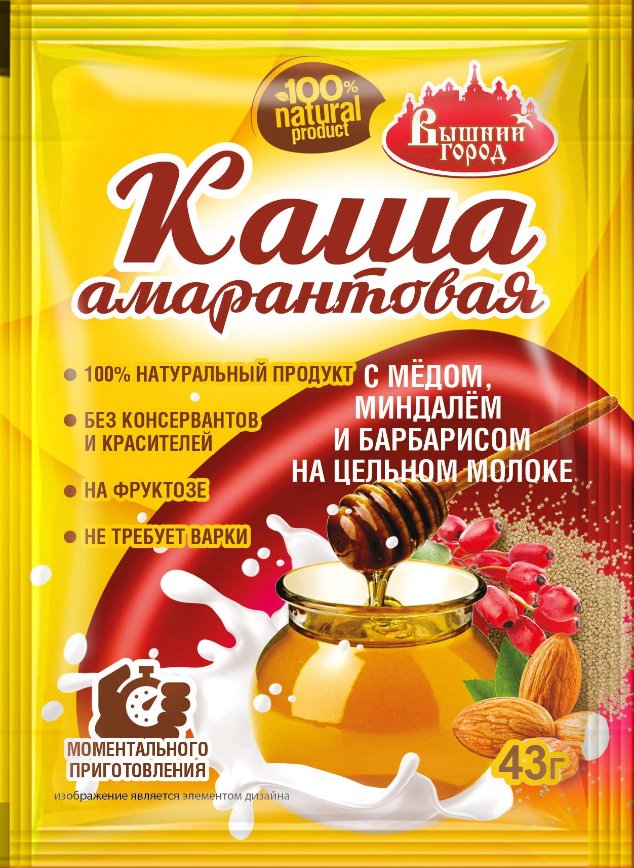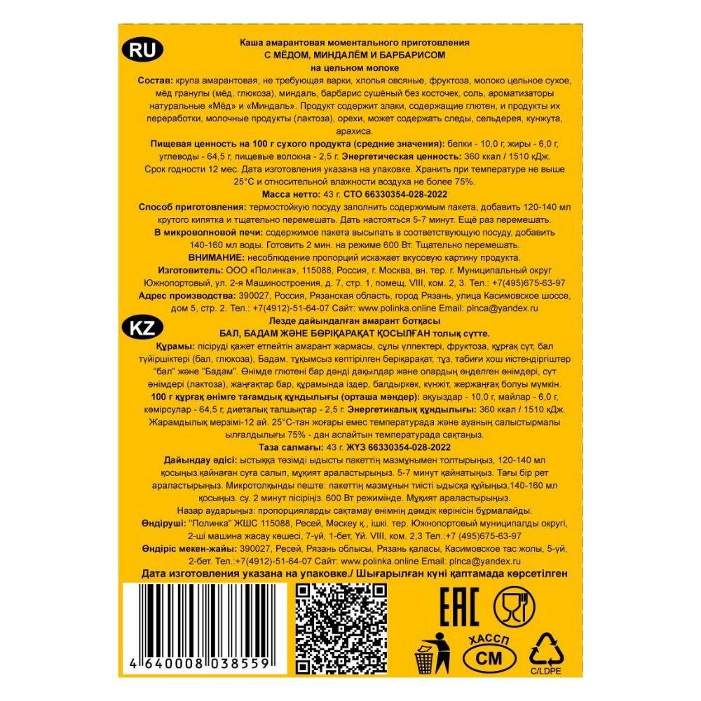 крупа амарантовая не требующая варки, хлопья овсяные, фруктоза, молоко цельное сухое, мед гранулы (мед, глюкоза), миндаль, арбарис сушеный без косточек, соль, ароматизаторы натуральные "Мед" и "Миндаль". Продукт содержит злаки, содержащие глютен, и продукты их переработки, молочные продукты (лактоза), орехи, может содержать следы сельдерея, кунжута, арахиса.